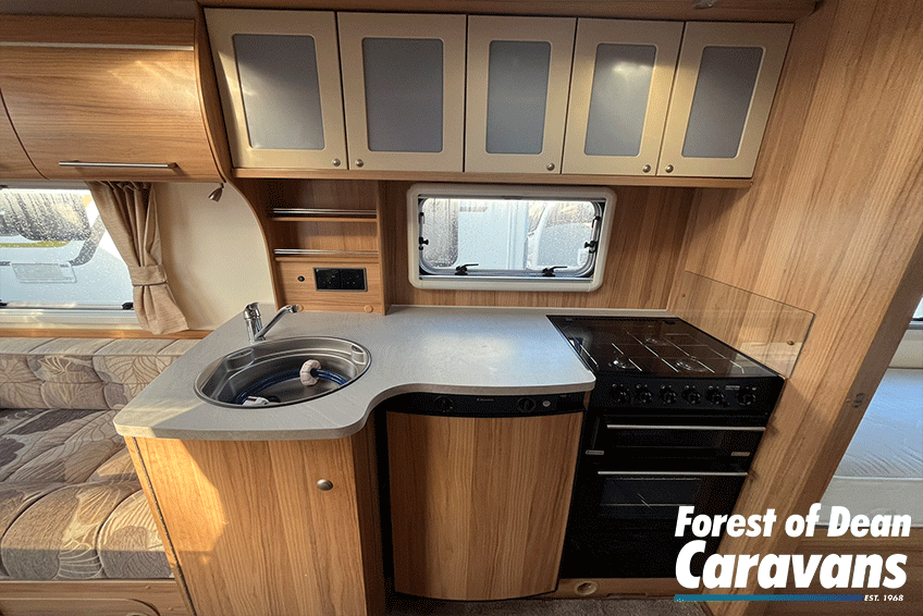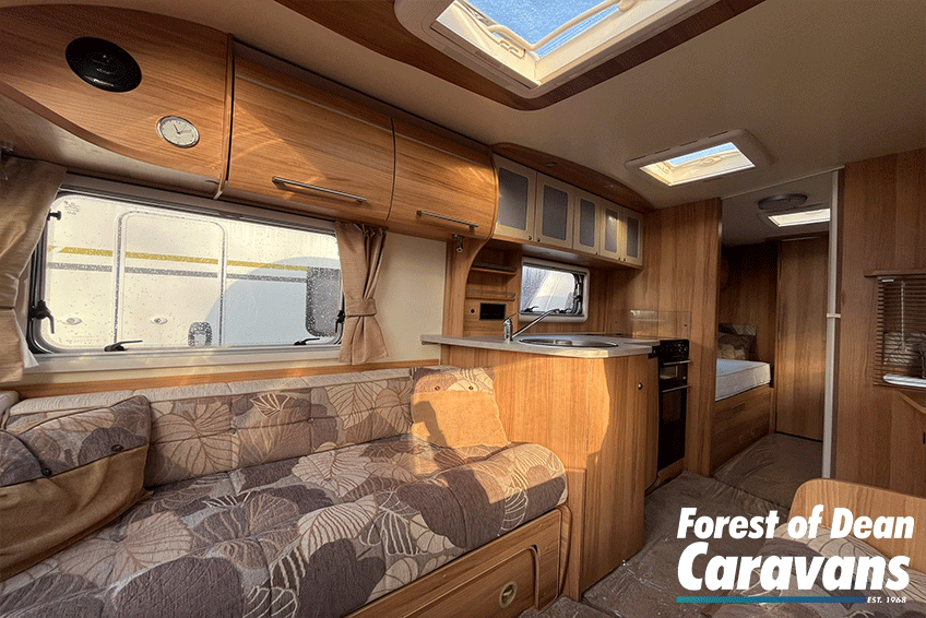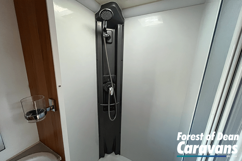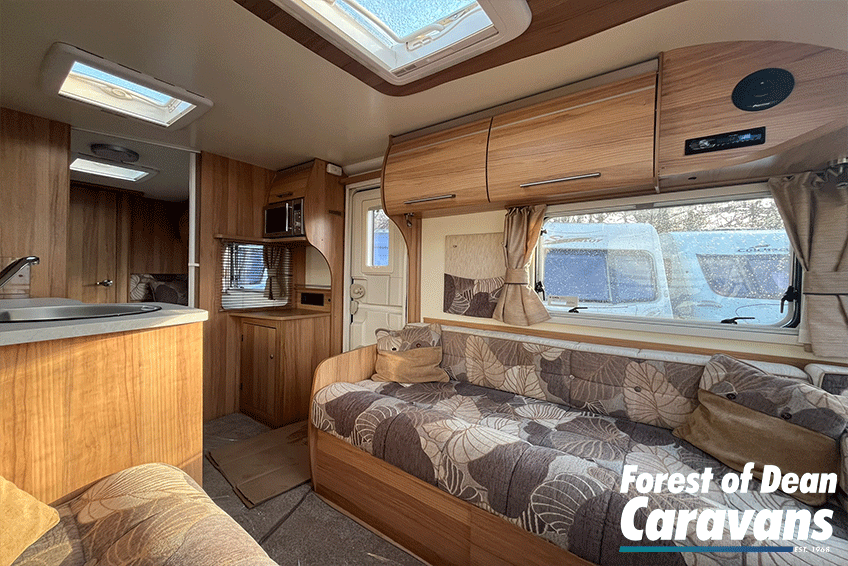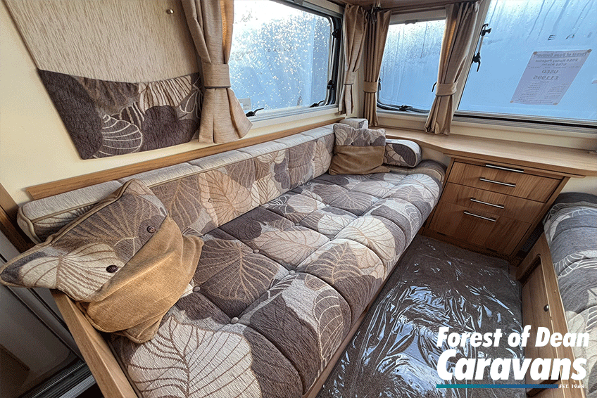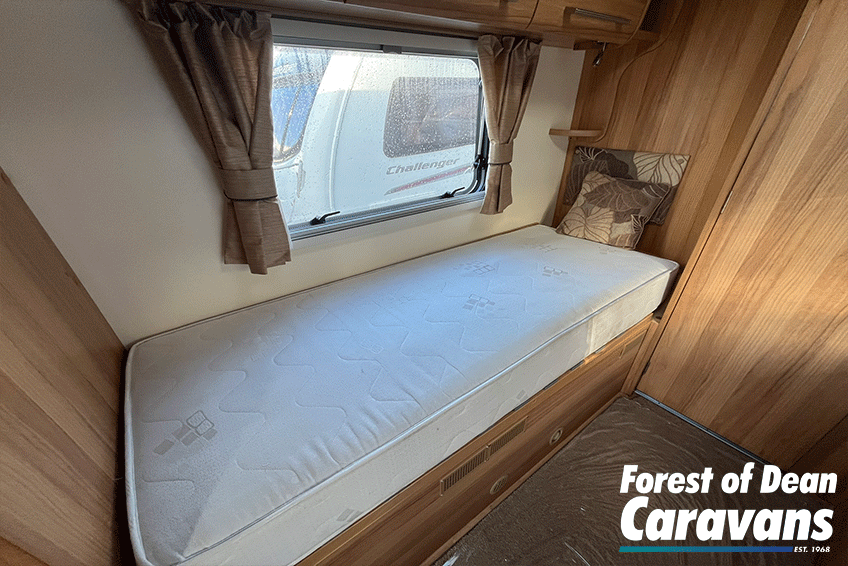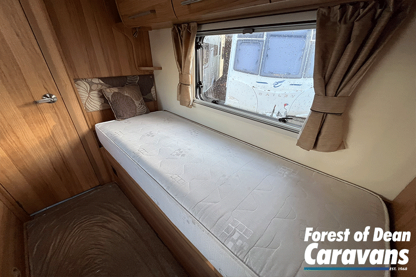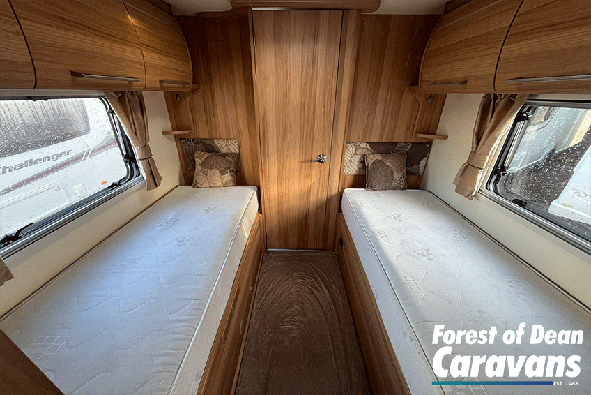 Inside, you’ll find a bright, spacious interior thanks to the large panoramic front window and thoughtfully designed layout. The twin fixed single beds are a standout feature, providing superior comfort and a great night’s sleep without needing to convert the seating area each evening. The front lounge easily transforms into an additional double bed, allowing this model to sleep up to four people comfortably.