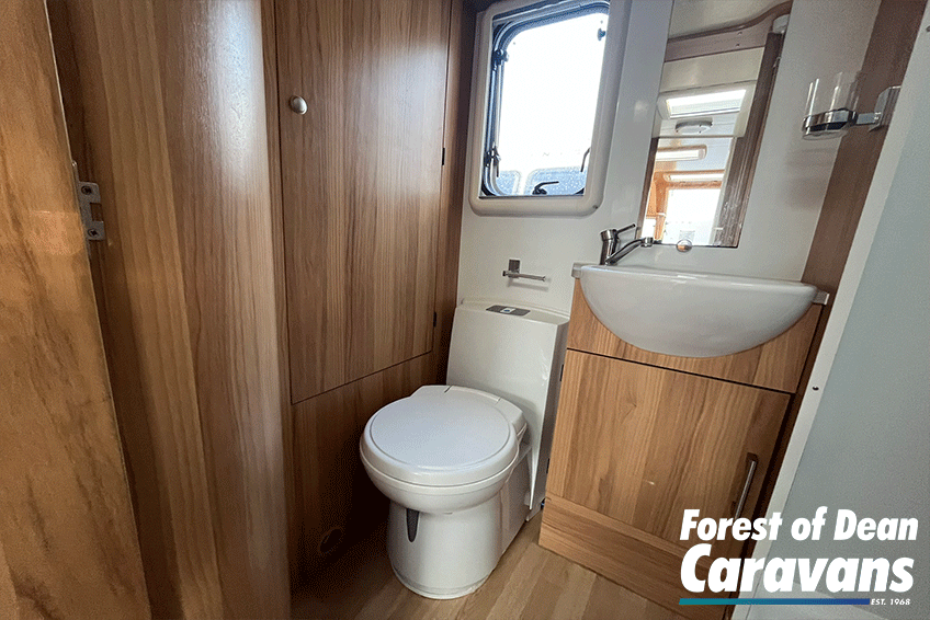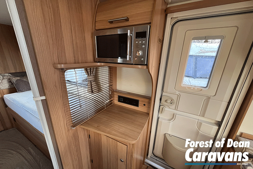 The well-equipped kitchen includes a full oven and grill, hob, microwave, and generous worktop space, ideal for preparing family meals on the go. Ample storage throughout – including overhead lockers, wardrobe, and under-bed compartments – ensures you’ll have space for all your travel essentials.