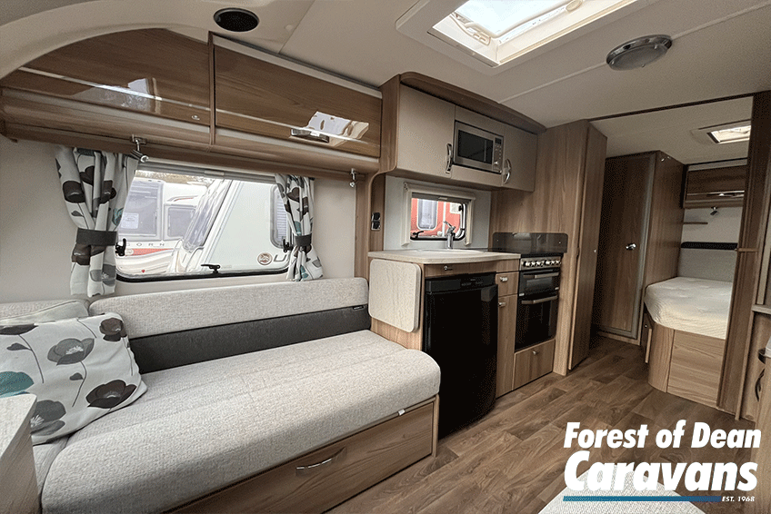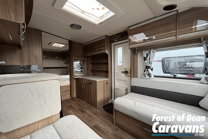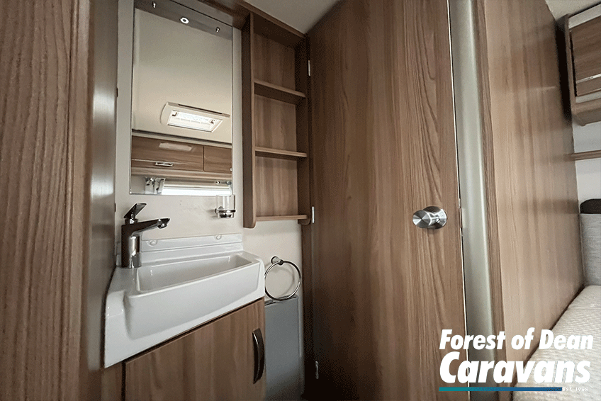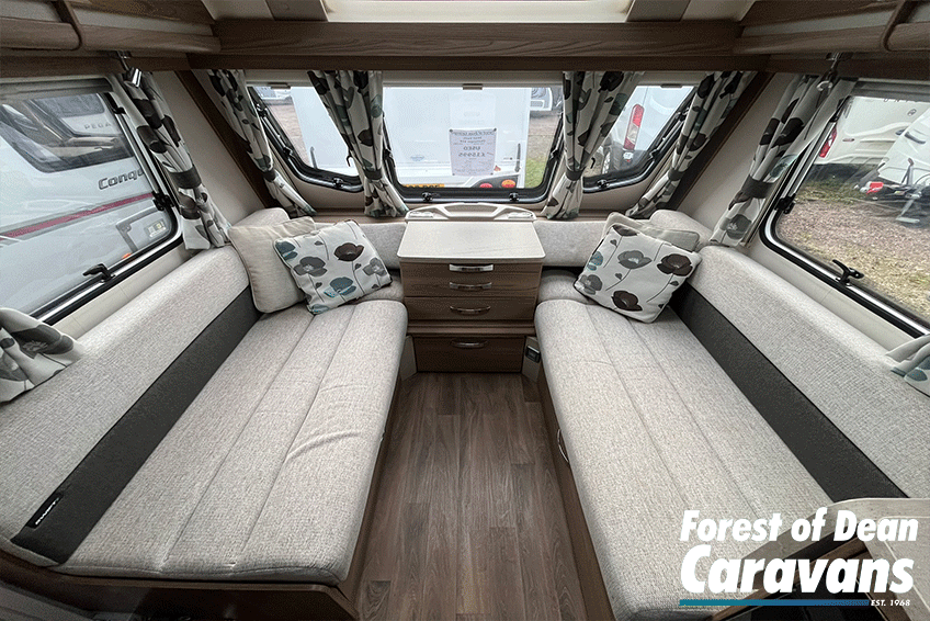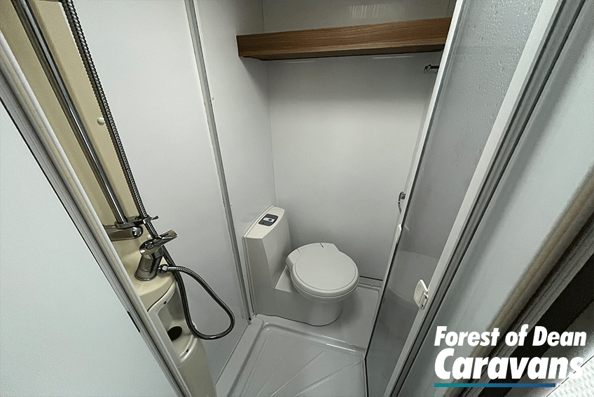 Step inside and you’re welcomed by a bright, modern lounge featuring plush high-quality upholstery and large panoramic windows that flood the space with natural light. The parallel seating effortlessly converts into a generous double bed, while the fixed rear bed provides comfort and ample storage. The corner washroom is fully equipped with its shower and electric flush toilet - making a compact fixed bed caravan with impressive spec levels.