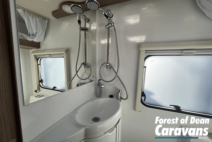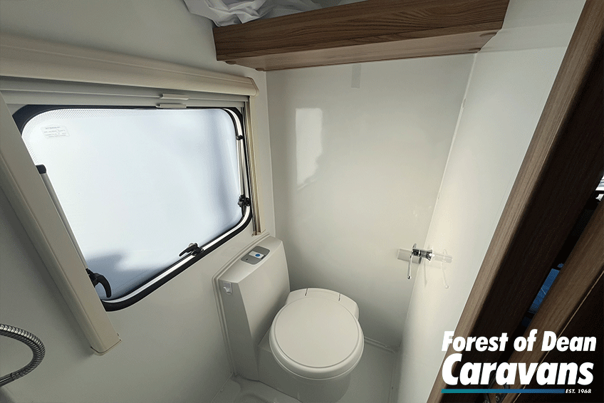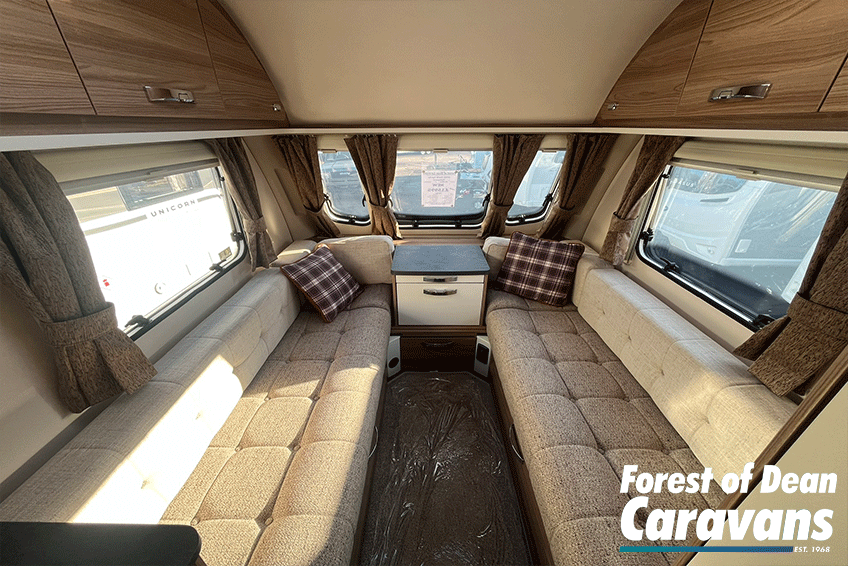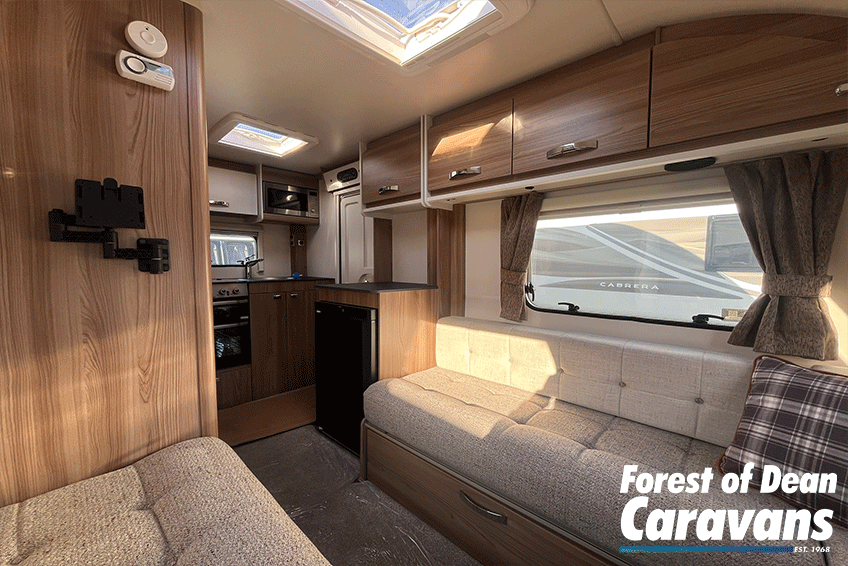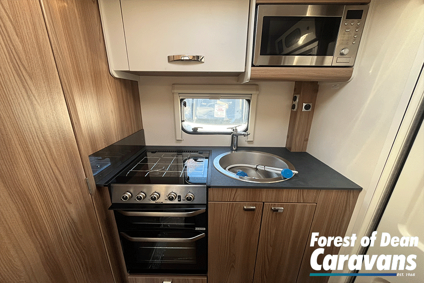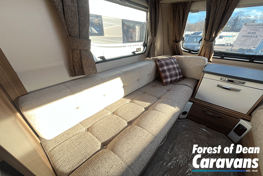 Inside, you’ll find a comfortable lounge area that easily converts into a generous double bed, giving you the best of both worlds: relaxing daytime seating and a cosy sleeping space at night. Large windows and a panoramic front window flood the caravan with natural light, creating an open and airy feel.