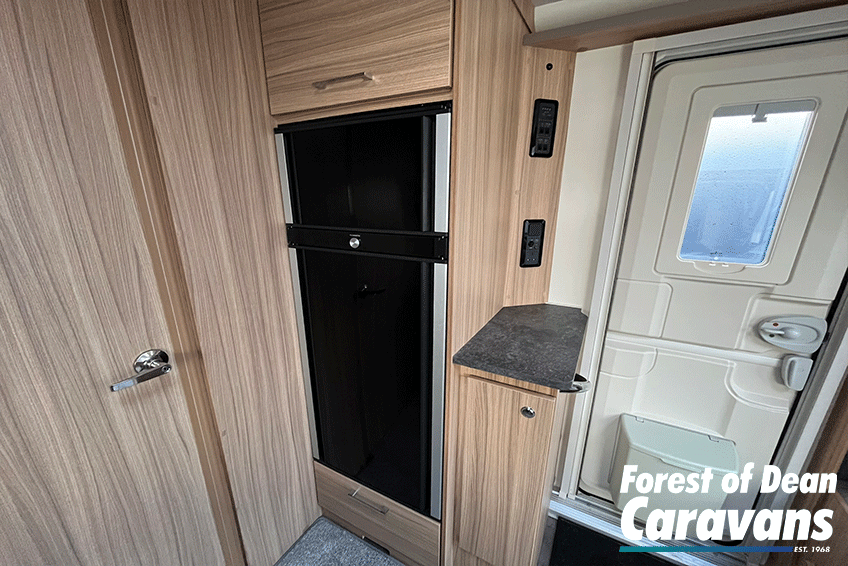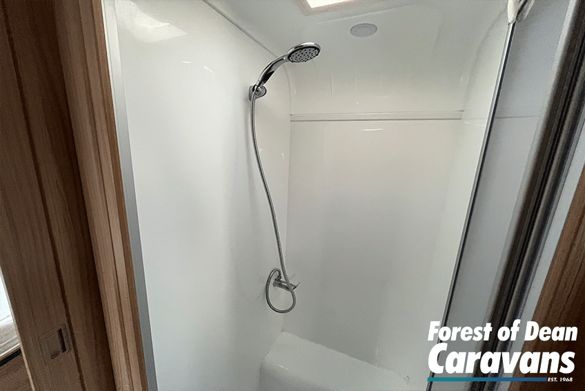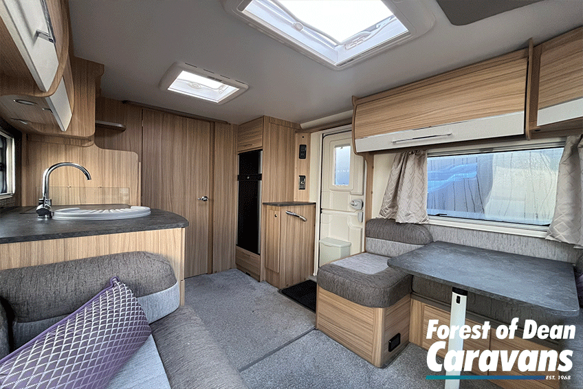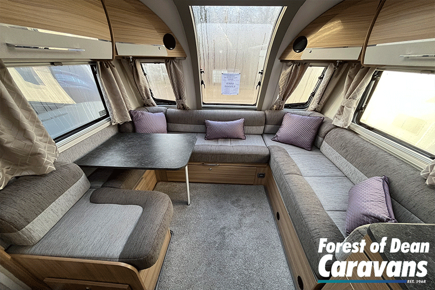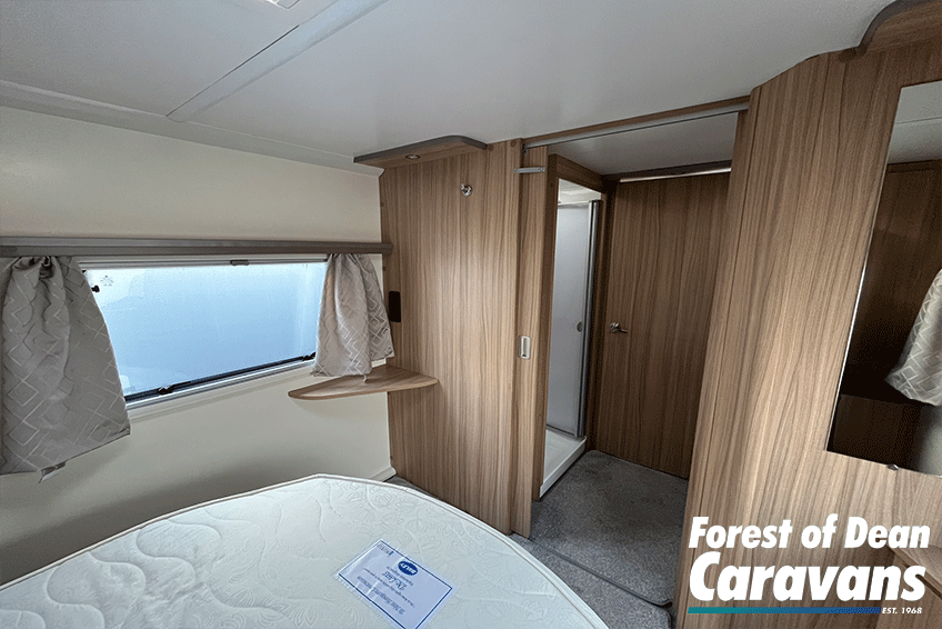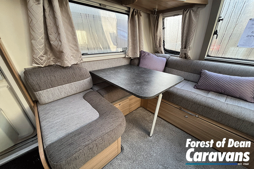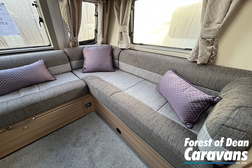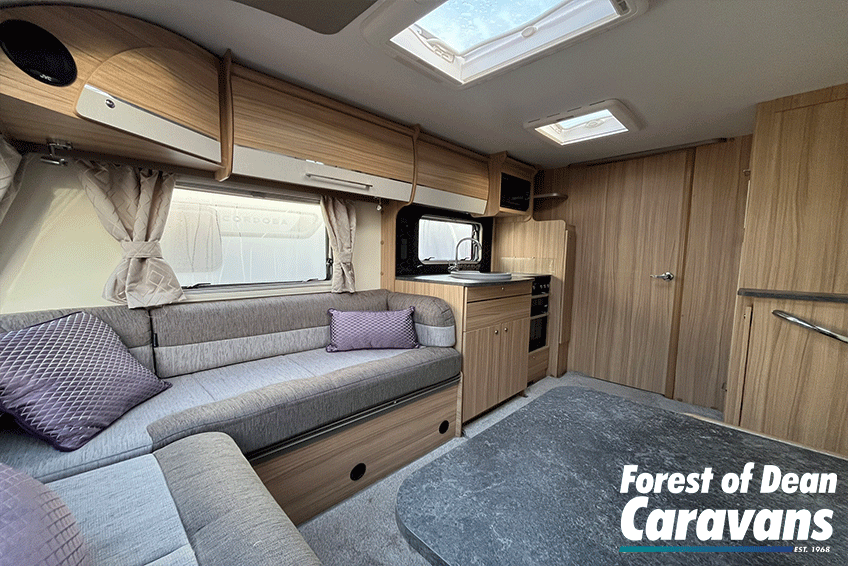 Step inside and you’re greeted by a bright, open-plan living area with Bailey’s signature panoramic vertical front infinity window, flooding the lounge with natural light. The incredibly spacious G-shaped seating quickly transforms into a generous additional double bed, making it ideal for hosting family or friends. Soft-touch fabrics, premium fixtures, and LED lighting create a warm, contemporary feel throughout.