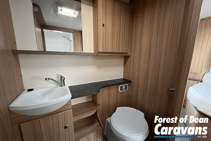 To the rear sits the Messina’s standout feature – a luxurious island bed with pocket-sprung mattress and wardrobes on either side. The adjoining full-width central washroom includes a separate shower cubicle, basin, and cassette toilet, offering hotel-style comfort wherever your travels take you.