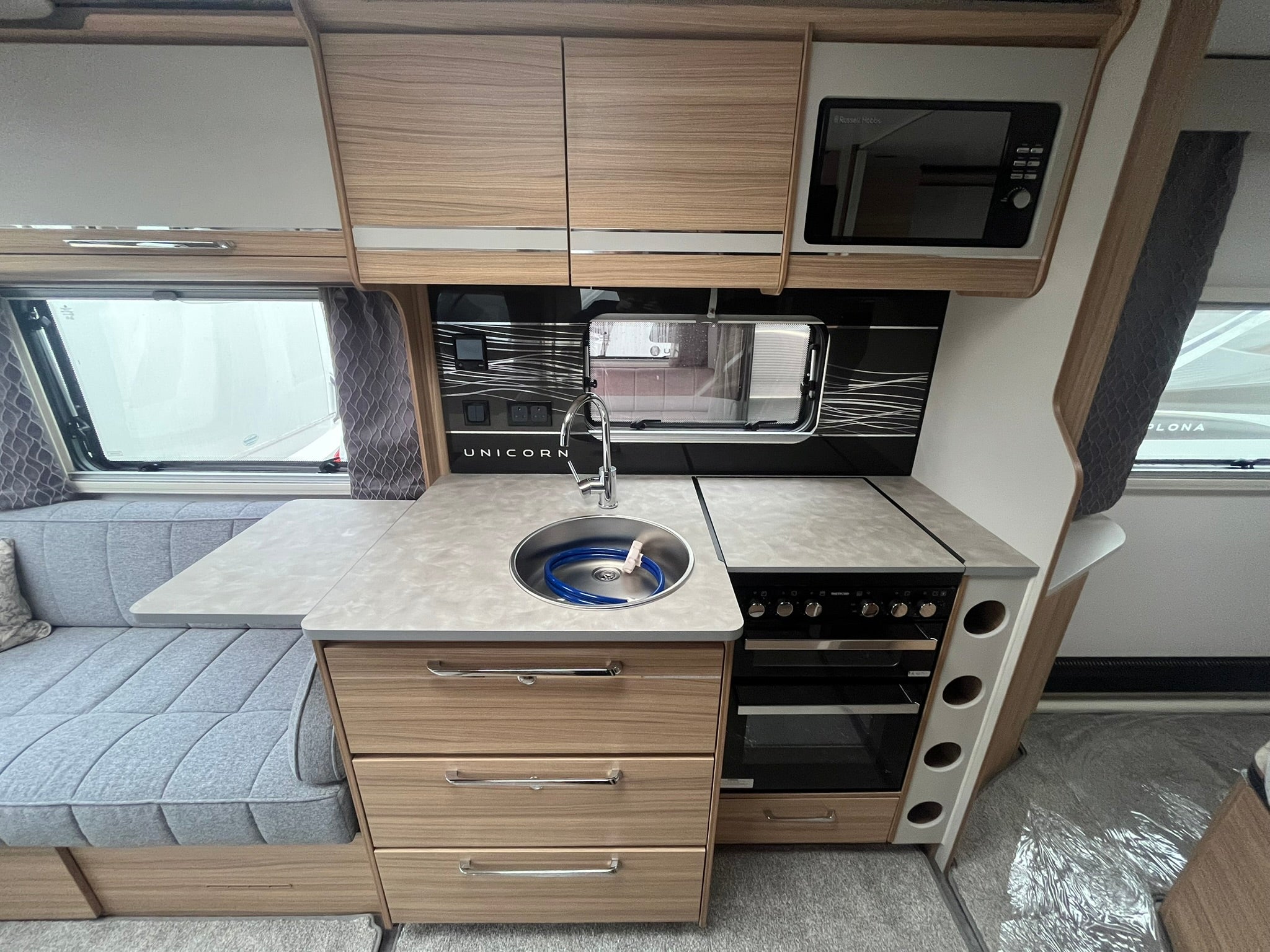 The mid-kitchen is a highlight, fitted with high-spec appliances including a dual-fuel hob, sleek microwave, oven and grill, and a large fridge freezer—everything you need to enjoy home-cooked meals on the go. Quality finishes, soft-close cabinetry, and well-placed lighting create a truly modern, premium feel.