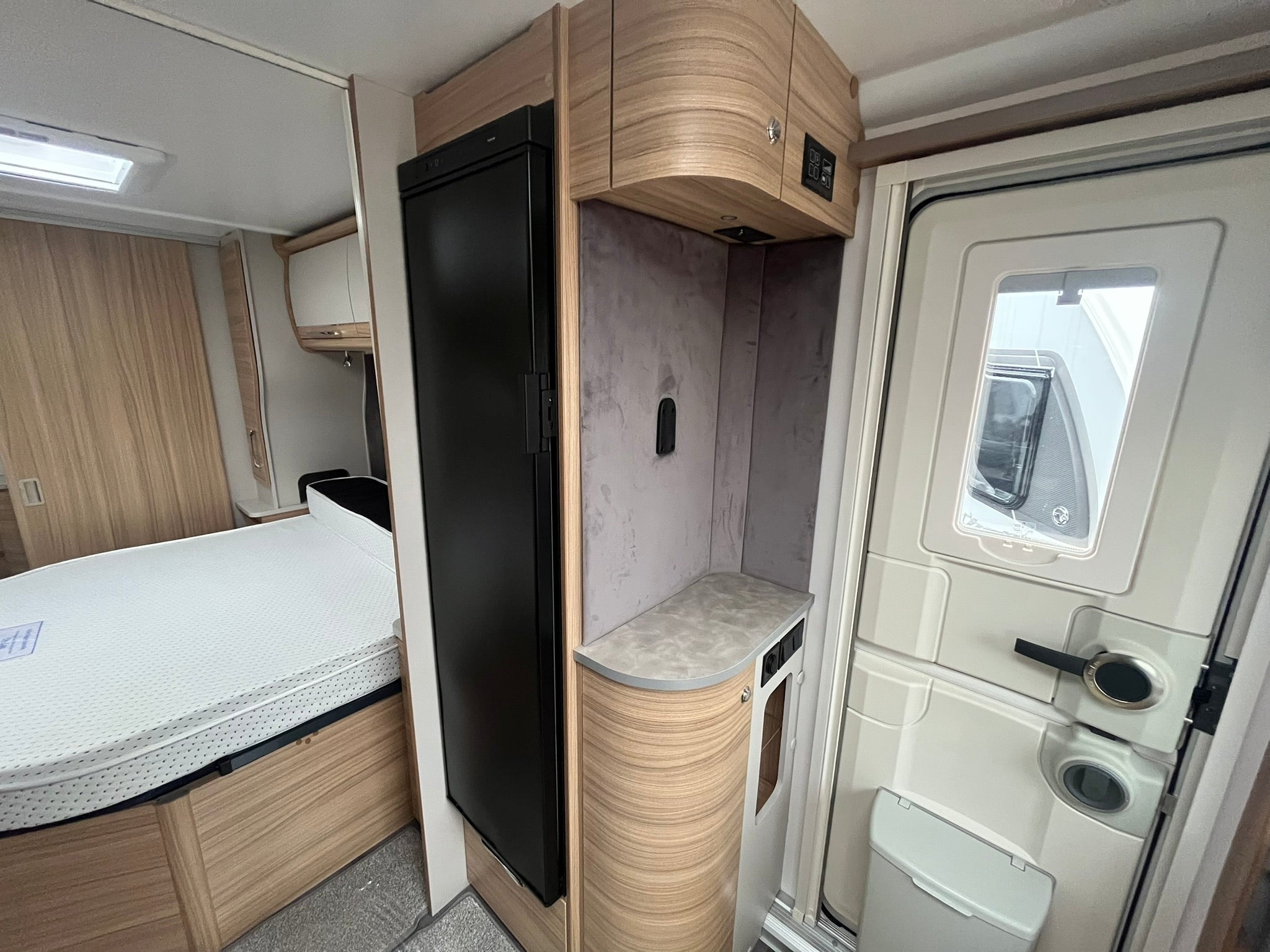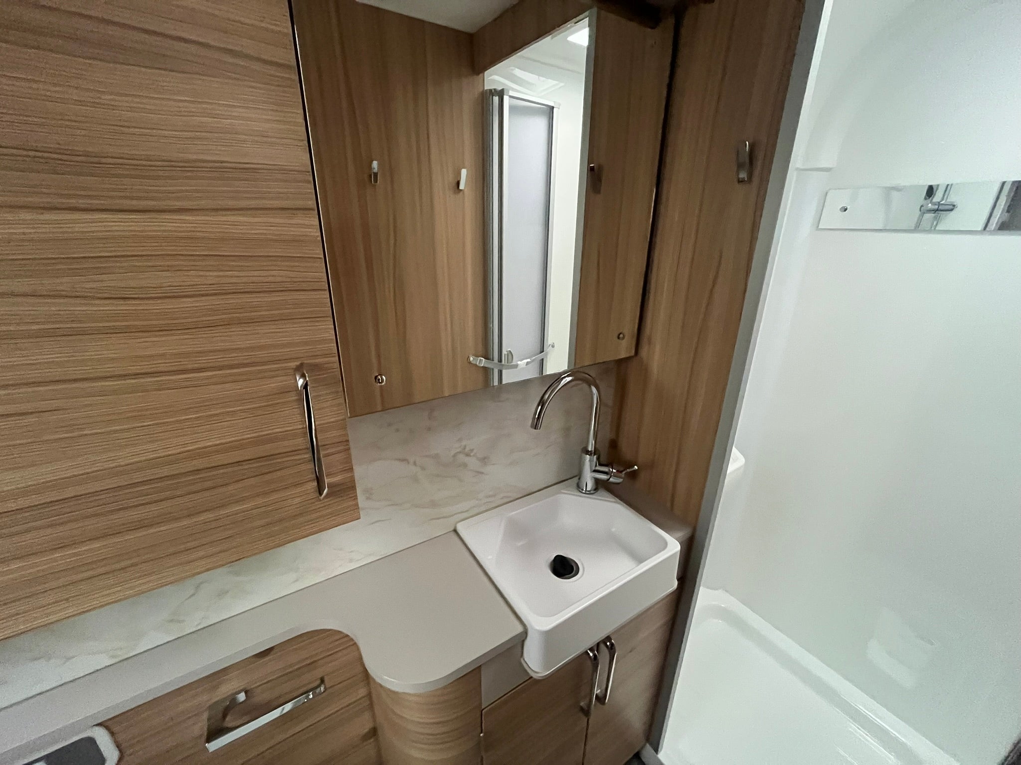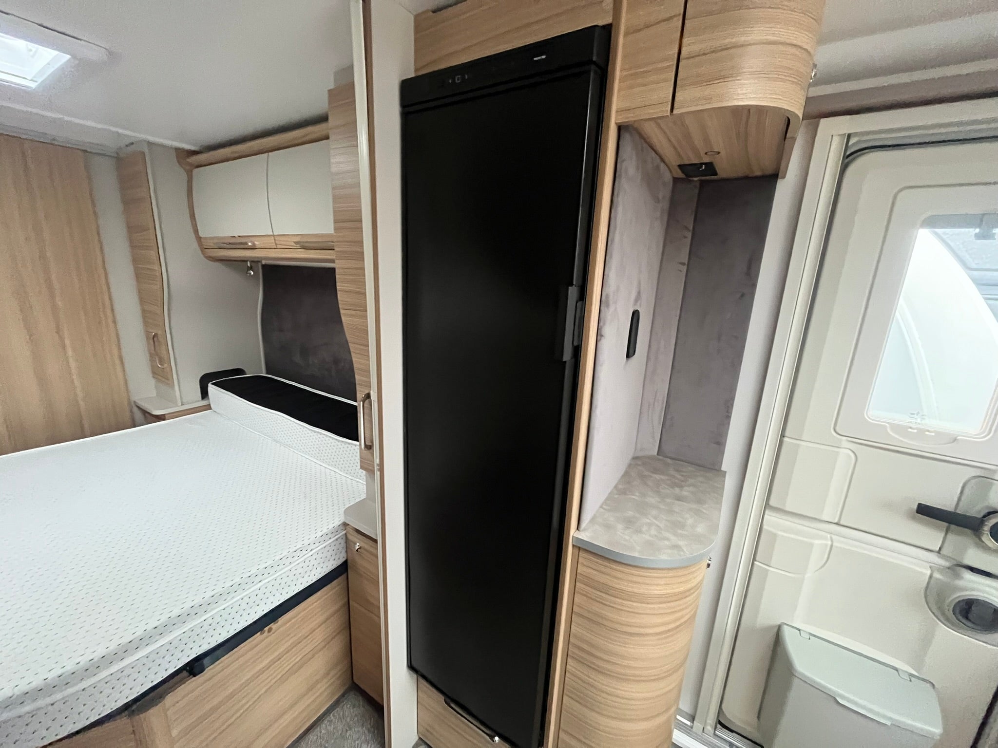 The washroom boasts a fully lined shower cubicle, contemporary basin, Thetford toilet, and loads of storage, giving you all the comforts of home wherever your travels take you.