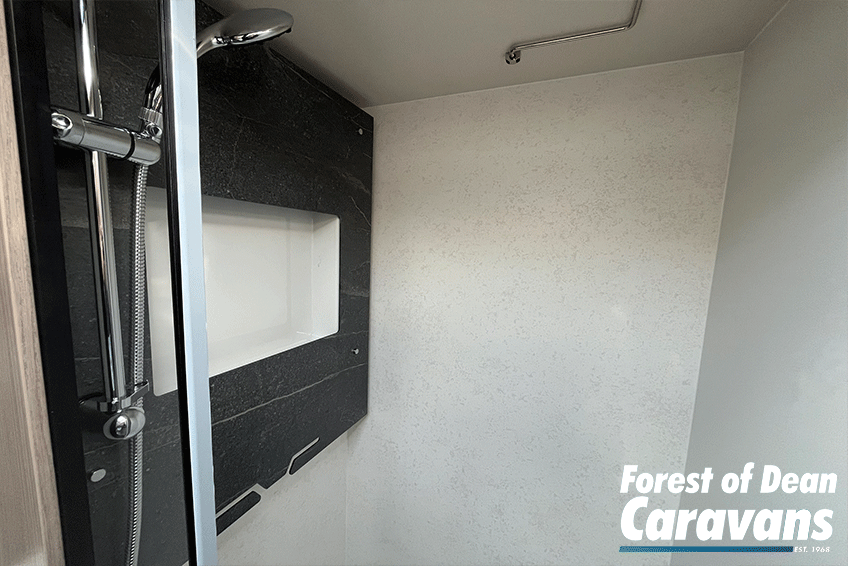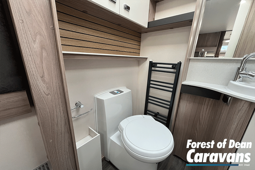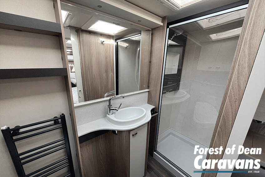 The well-appointed washroom includes a separate shower cubicle, stylish basin, and cassette toilet, providing all the conveniences of home while touring.