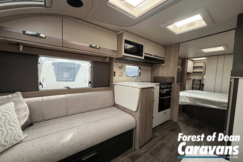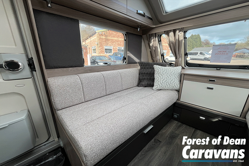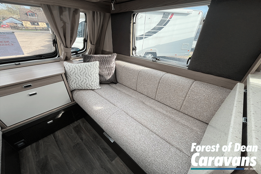 Inside, the Conqueror 580 offers a beautifully finished interior with contemporary styling, soft furnishings, and high-quality materials throughout. The spacious front lounge provides a comfortable seating area by day and easily converts into a large double bed by night, making it perfect for couples or small families. Large panoramic windows flood the living space with natural light, creating a bright and welcoming atmosphere wherever your travels take you.