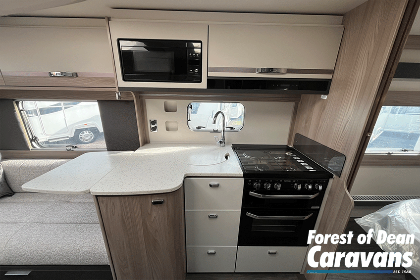 The fully equipped kitchen is ideal for cooking on the road, featuring a modern hob, oven, grill, microwave, and generous workspace. Ample storage ensures you have plenty of room for cookware and essentials, while the sleek cabinetry adds a premium touch to the space.