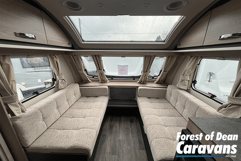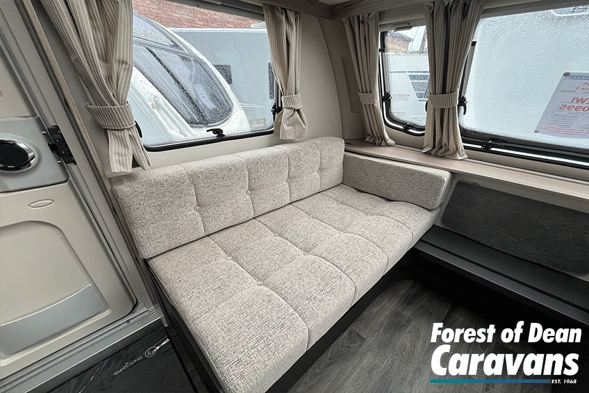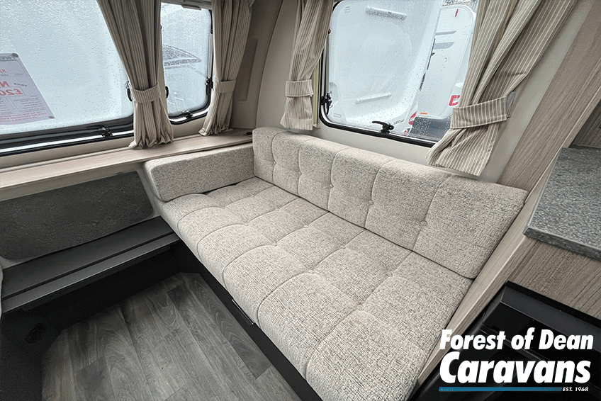 Step inside to an airy, welcoming interior finished with modern soft furnishings and a stylish, practical layout. The front lounge transforms easily into a generous double bed, while the fixed rear bed offers superb comfort without the need for nightly assembly. The fully equipped kitchen includes a hob, oven/grill, fridge freezer, and plentiful storage—perfect for preparing meals wherever you travel.