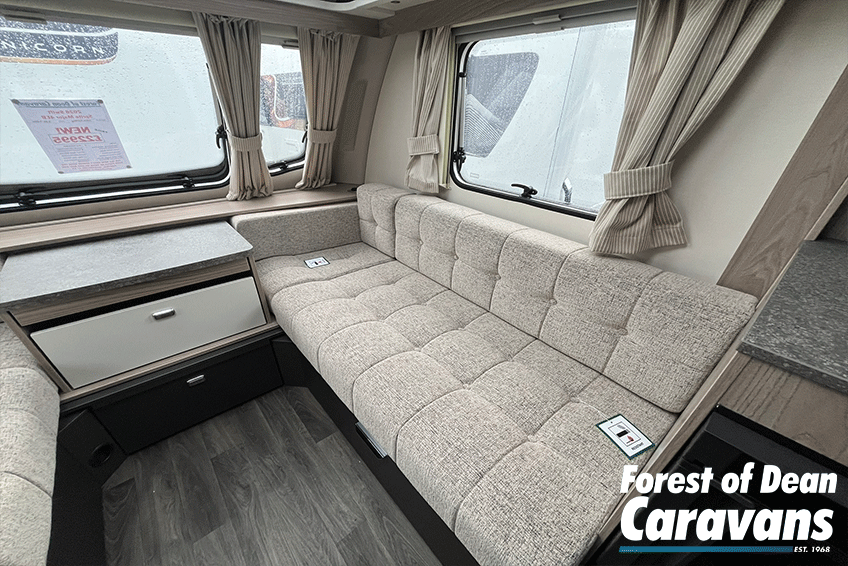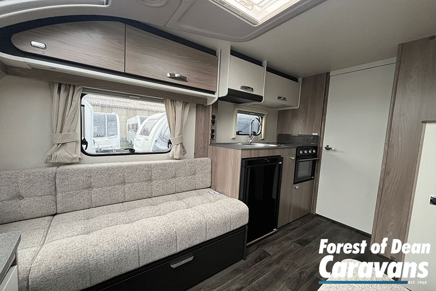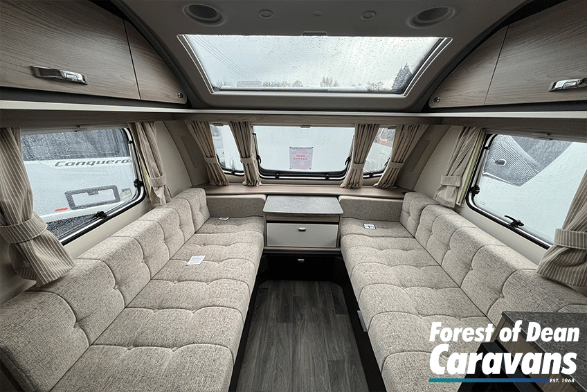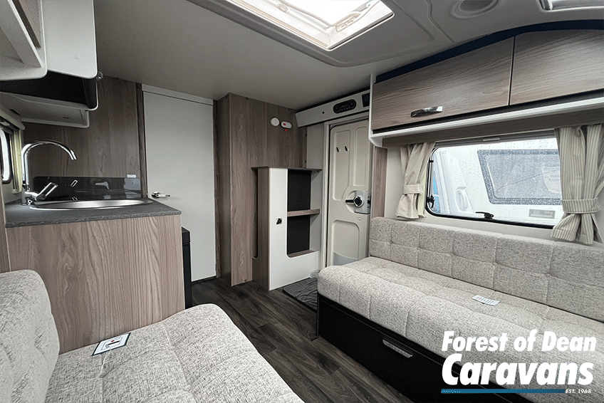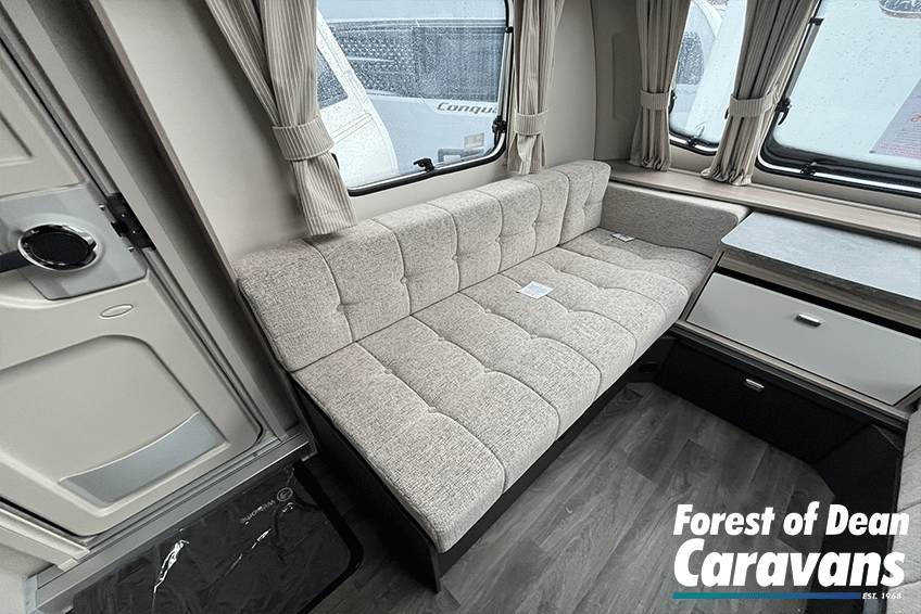 Step inside and you’re greeted by a bright, airy lounge with large panoramic front windows that flood the space with natural light. The parallel seating converts effortlessly into a generous double bed, while premium fabrics and upgraded soft furnishings create a warm, modern feel. LED lighting throughout enhances the ambience, whether you’re relaxing at night or preparing for the day ahead.