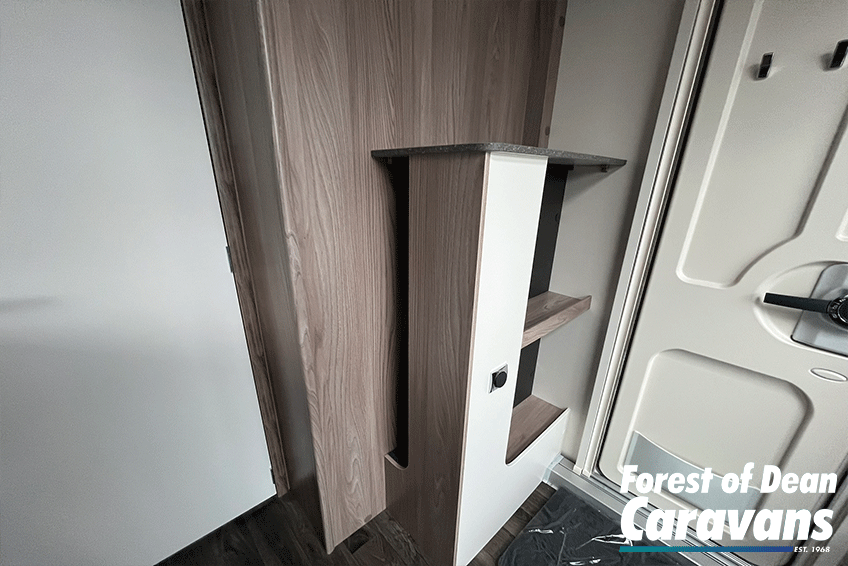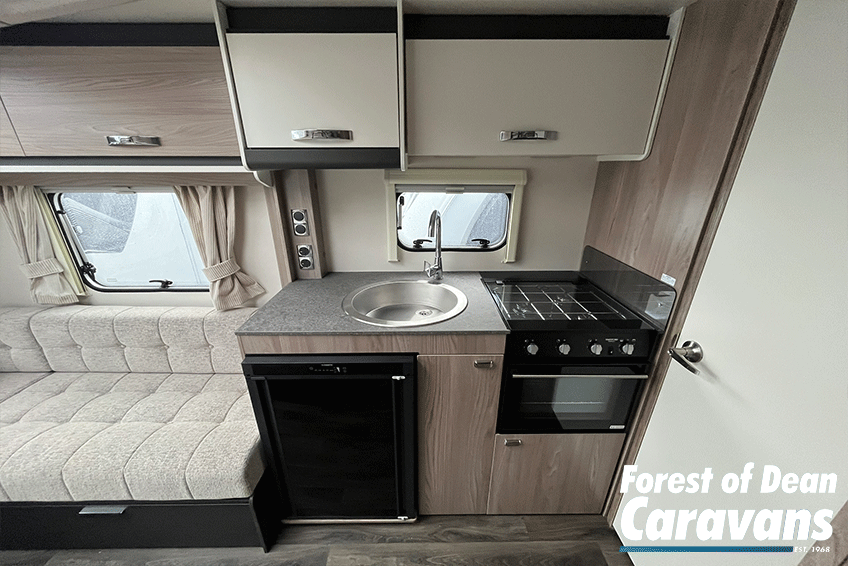 At the heart of the caravan is a well-equipped kitchen featuring a sleek grey worktop, oven/grill combination, hob and a spacious fridge/freezer—everything you need for effortless cooking on the go. Storage is plentiful, with thoughtfully placed cupboards and lockers for all your holiday essentials.